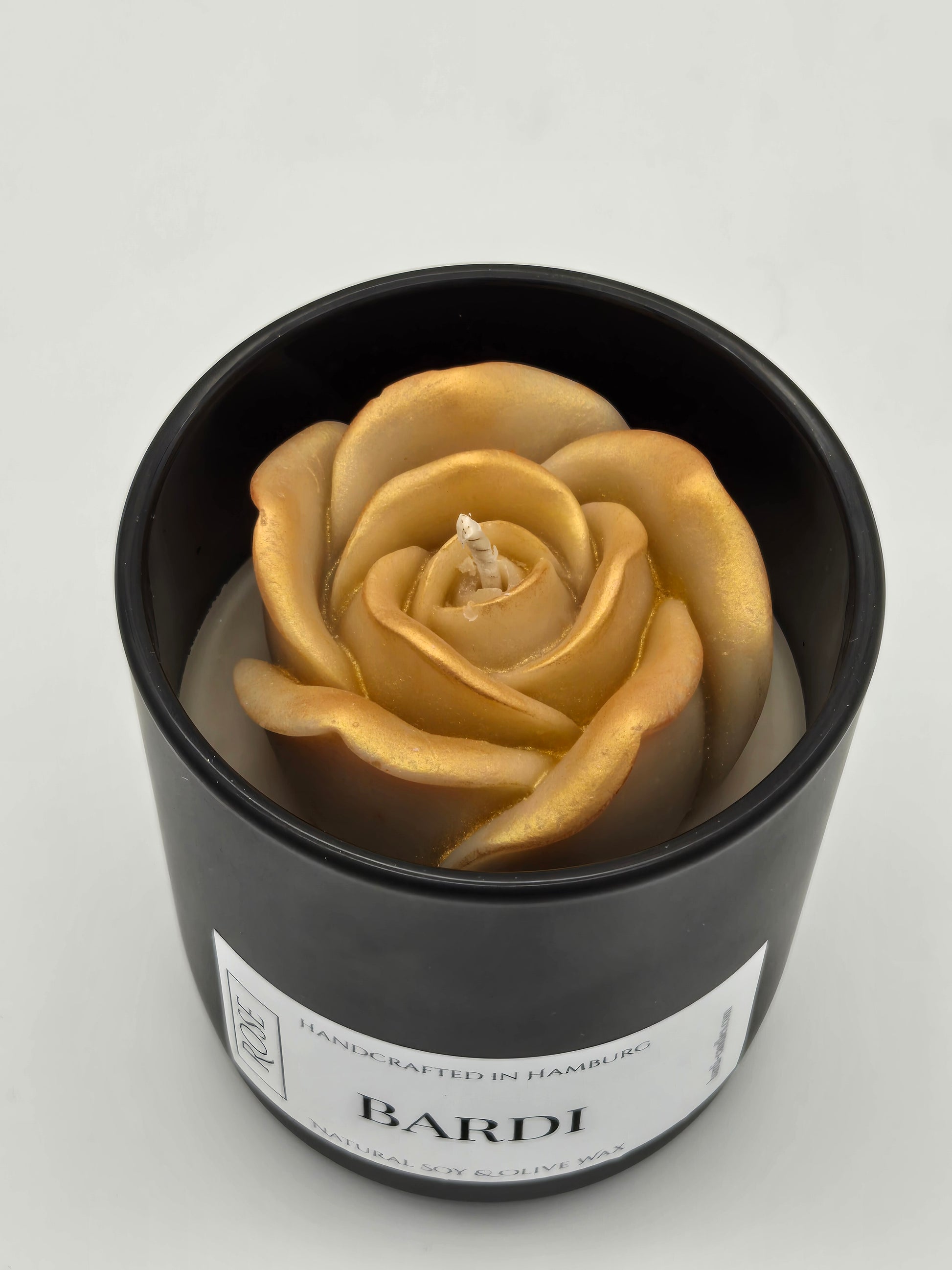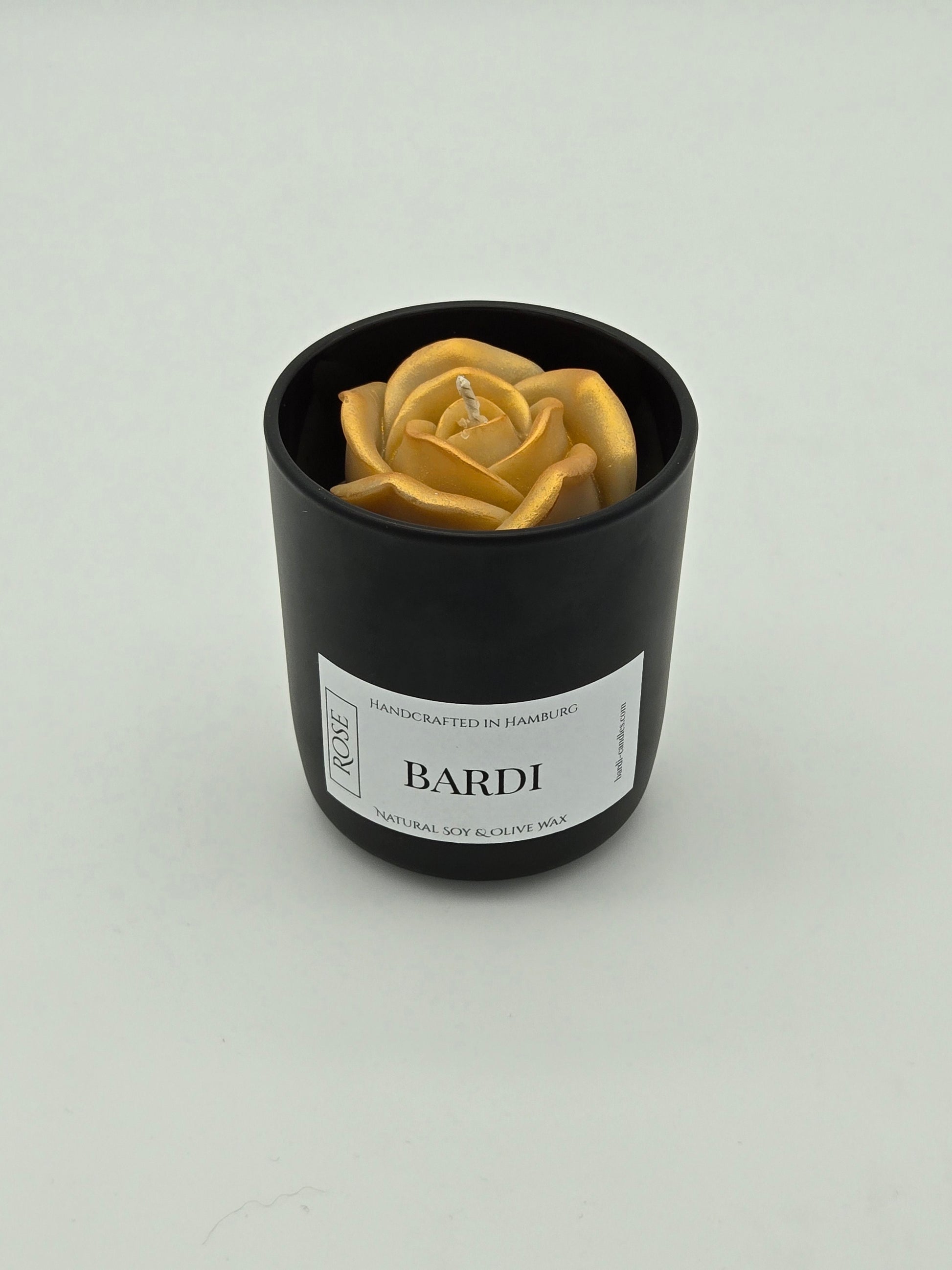 Elevate your atmosphere with the mysterious and alluring aroma of our Black Orchid signature candle. Encased in a sleek, opaque black jar, this Bardi creation is meticulously handcrafted using our bespoke blend of natural soy and olive wax. The dark aesthetic provides a contemporary look, revealing a stunning, hand-molded golden rose bloom only when opened for a touch of hidden luxury.