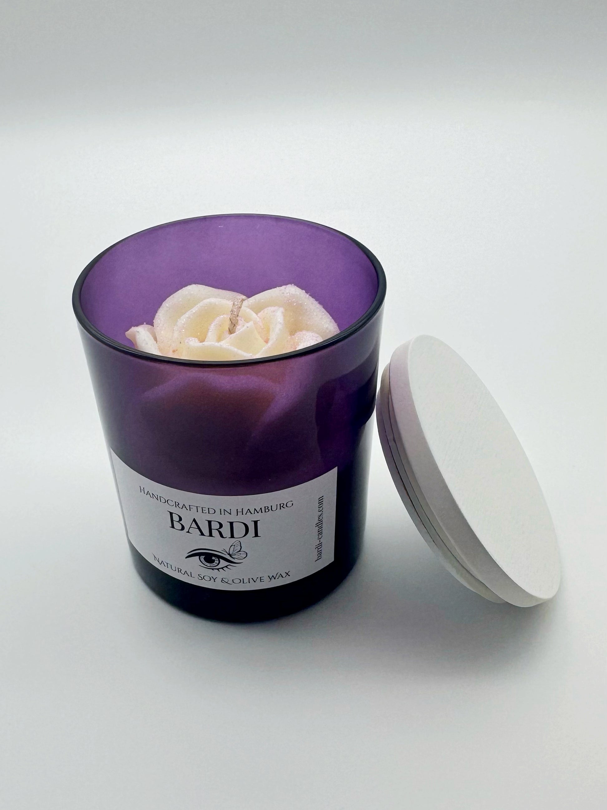 Introduce a touch of modern luxury to your space with this signature Bardi candle designed in a sleek purple jar. Meticulously handcrafted using our bespoke blend of natural soy and olive wax, this candle offers a clean, soft and slow burn. The opaque jar provides a contemporary look, revealing a stunning, hand-molded white rose bloom only when opened.